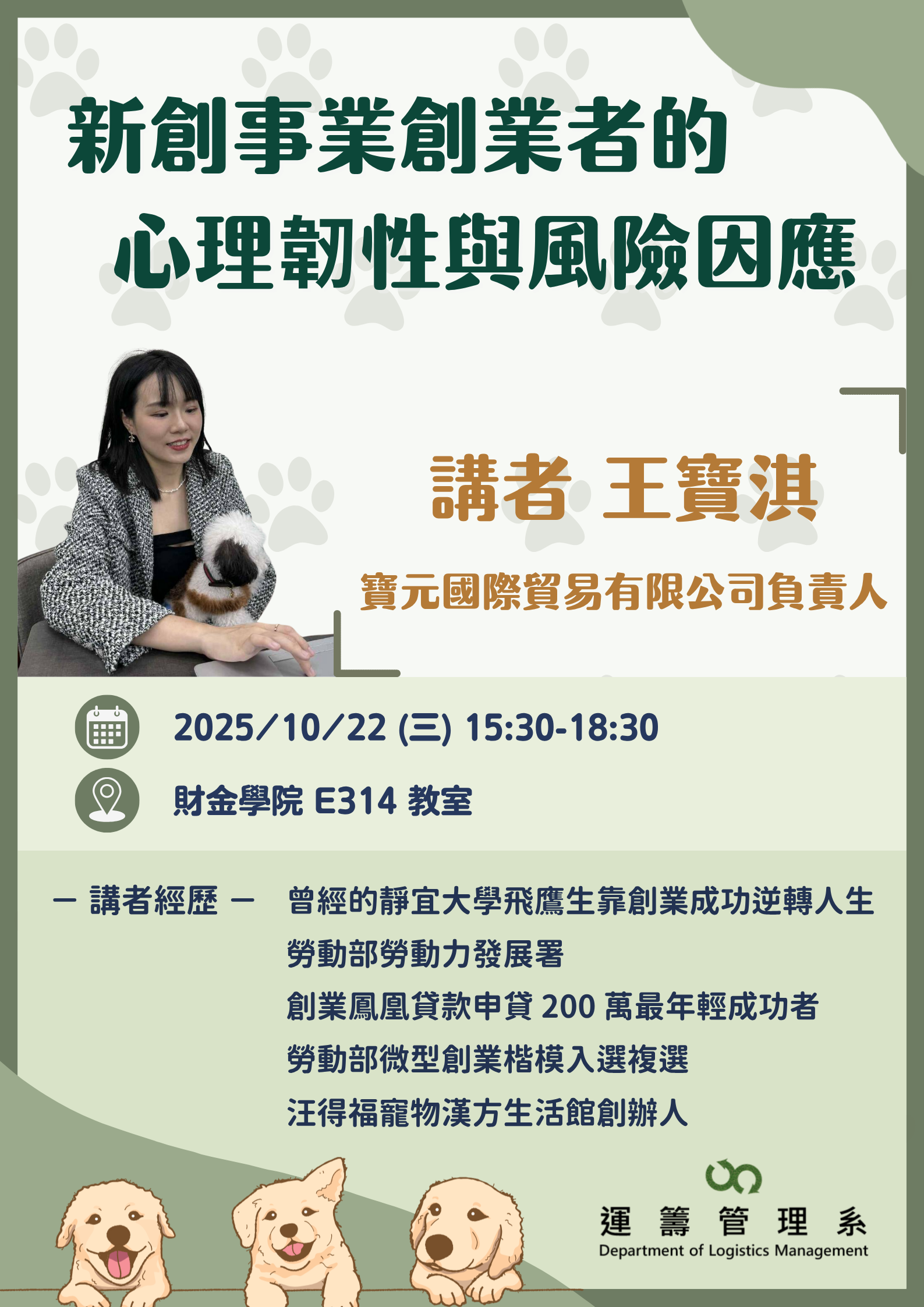 【講座】114年10月22日(三)-新創事業創業者的心理韌性與風險因應